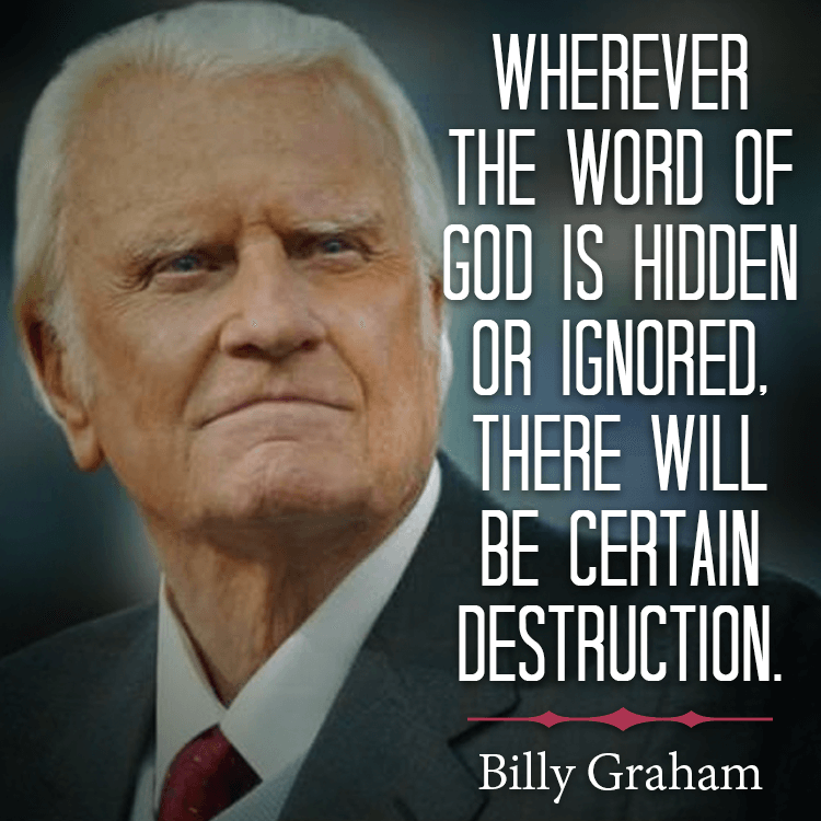 Wherever the Word of God is hidden August 15, 2019 Wherever the Word of God is hidden or ignored, there will be certain destruction. – Billy Graham