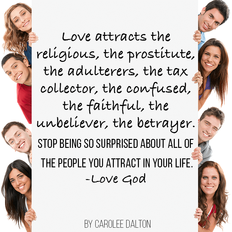 Love attracts the religious, the prostitute, the adulterers, the tax collector, the confused, the faithful, the unbeliever, the betrayer. Stop being so surprised about all of the people you attract in your life. -Love God | by Carolee Dalton